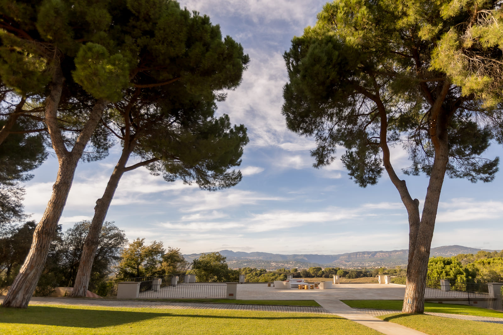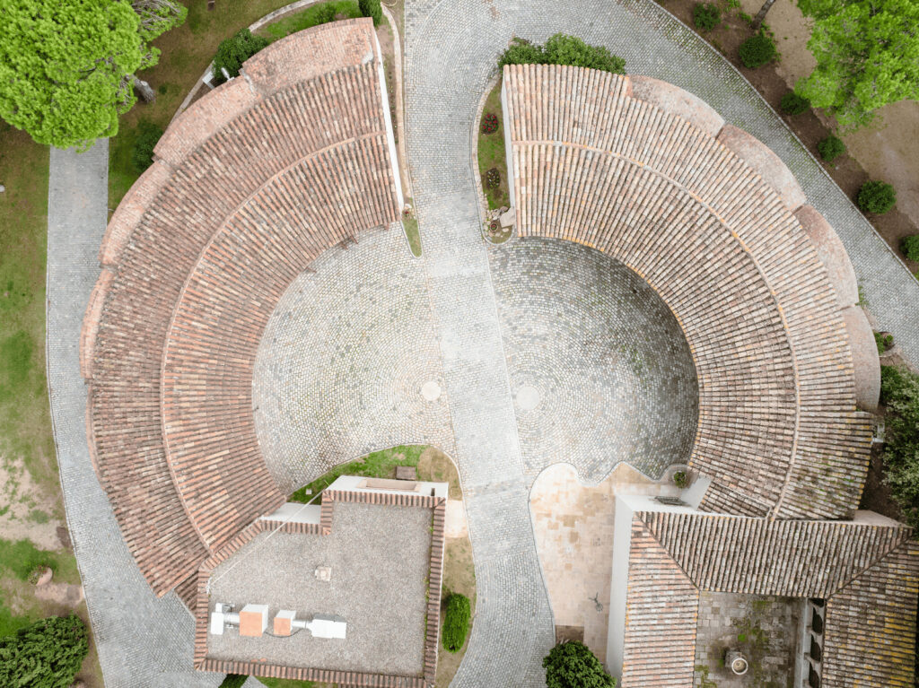 Caminos entre pinos que conducen a un patio circular, un escenario donde la imaginación cobra vida.